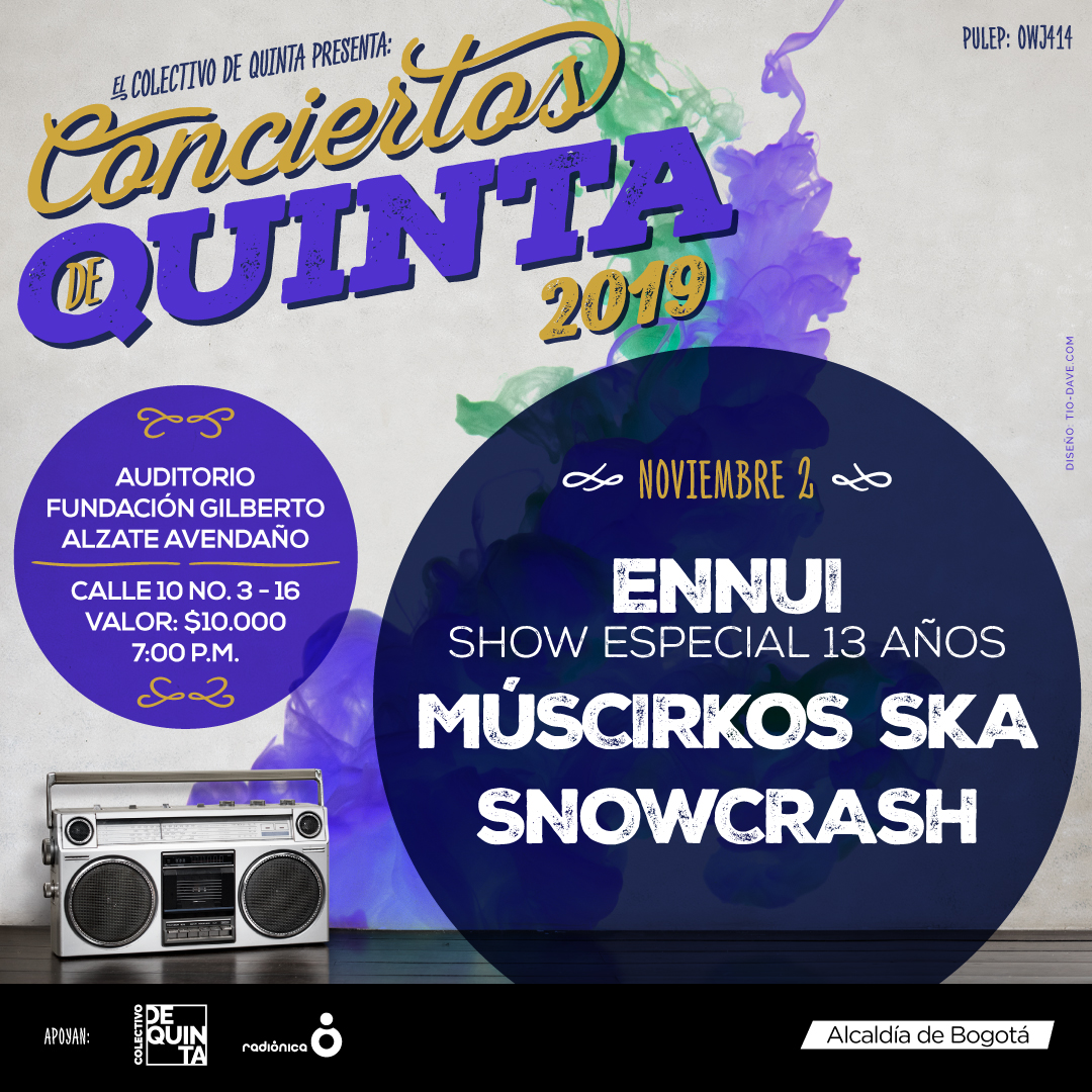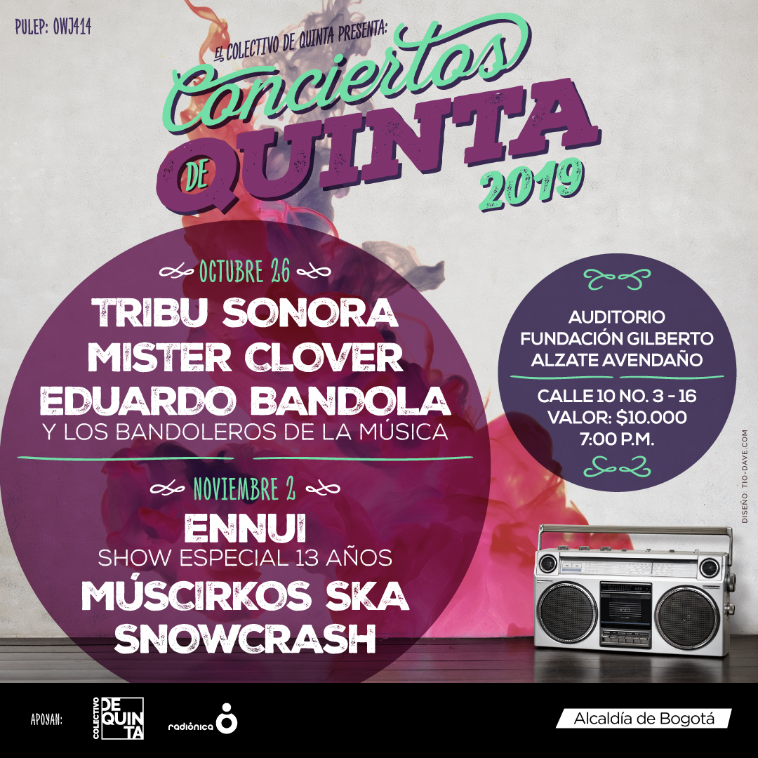 Ciclo de conciertos organizado por el Colectivo de Quinta en la Fundación Gilberto Alzate Avendaño en Bogotá. 2 Fechas para 6 agrupaciones musicales independientes.
